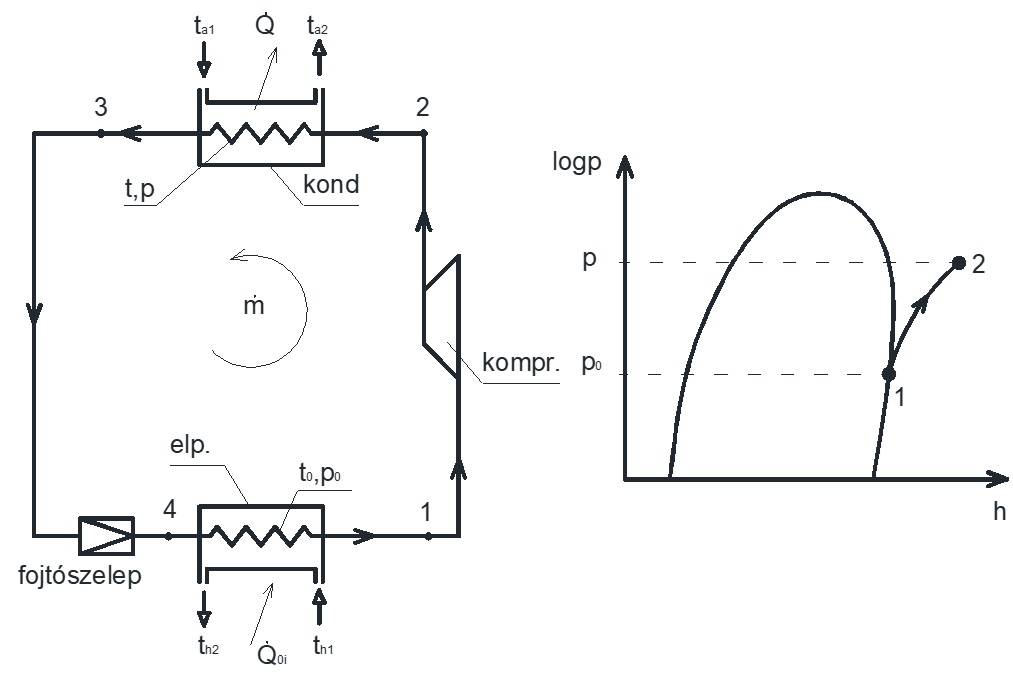 2. ábra Az egyfokozatú hűtőberendezés kapcsolási rajza és a komprimálás folyamata a logp-h diagramon