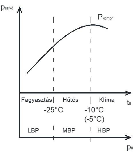 Ahol pszívó a szívóoldali nyomás (back pressure), Pkompr a kompresszor teljesítményfelvétele, LBP – low back pressure (fagyasztási tartomány); MBP – middle back pressure (hűtési tartomány); HBP – high back pressure (klímatartomány).
