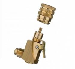 Refco sarok gyorscsatlakozó, a töltőcső hűtőközeg veszteség mentes rendszerre kapcsolásához. Beépített szelep kinyomó tüskével, reteszelt, leszedhető menetes tömített csatlakozóval.
